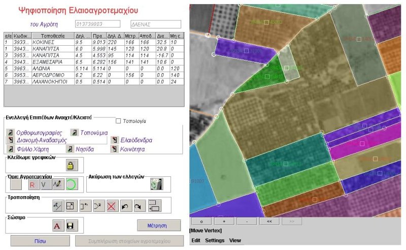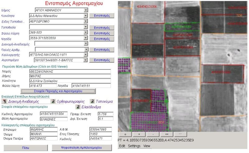 Διέθετε επίσης λειτουργίες χωρικού εντοπισμού (αγροτεμαχίων, ΟΤΑ, Τοπωνυμίων, κλπ) με τη χρήση εργαλείων Spatial queries της Oracle 9i Spatial. Τα αλφανουμερικά δεδομένα (στοιχεία παραγωγού, αγροτεμαχίου) και τα γεωμετρικά δεδομένα (αγροτεμάχια, ελαιόδενδρα, νησίδες, όρια πινακίδων, όρια ΟΤΑ, κλπ) ήταν συνδεδεμένα on-line και οποιαδήποτε αλλαγή στα γεωμετρικά δεδομένα είχε σαν αποτέλεσμα την αυτόματη αλλαγή των αλφανουμερικών δεδομένων. Το όλον έργο αφορούσε το σύνολο των Νομών της Θράκης, της Μακεδονίας(πλην Νομού Πιερίας) και της Θεσσαλίας. |